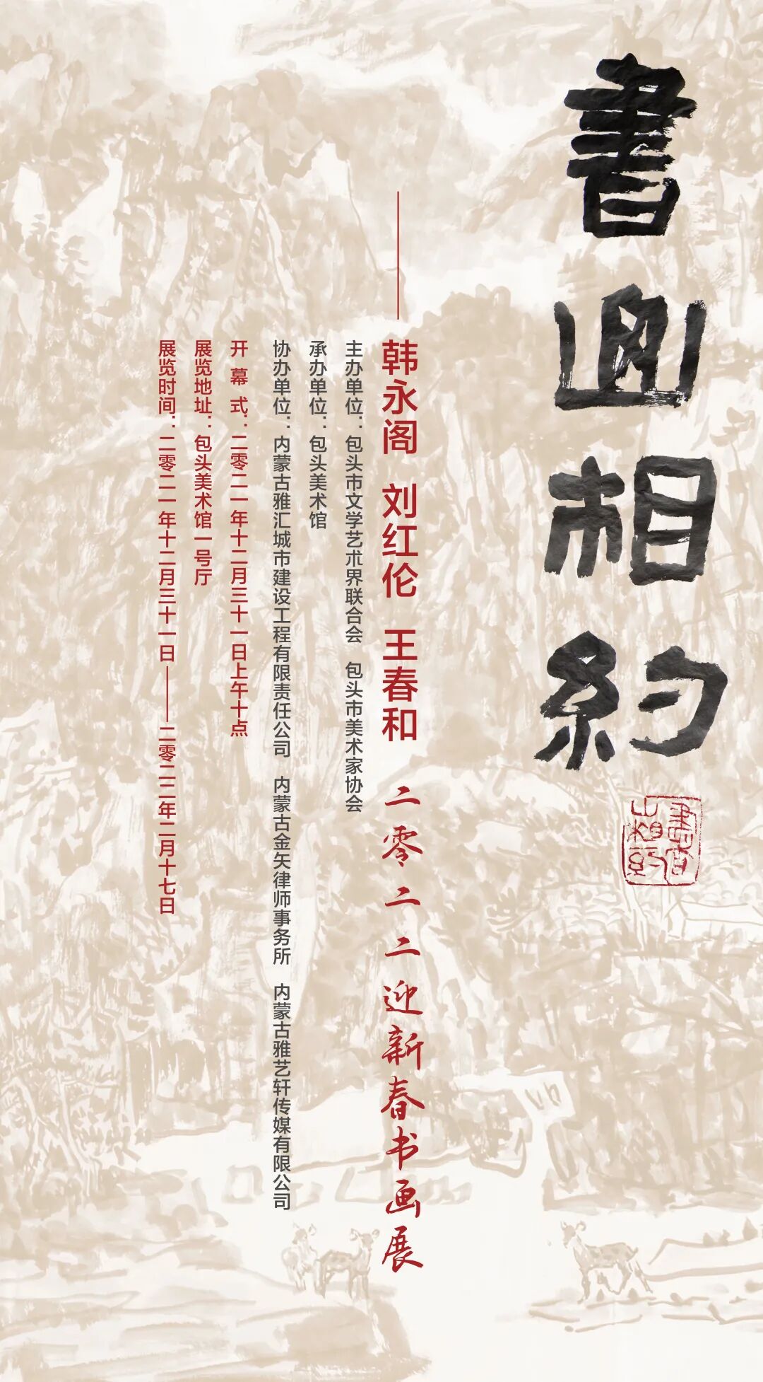 展览名称:书山相约——韩永阁、刘红伦、王春和2022迎新春书画展