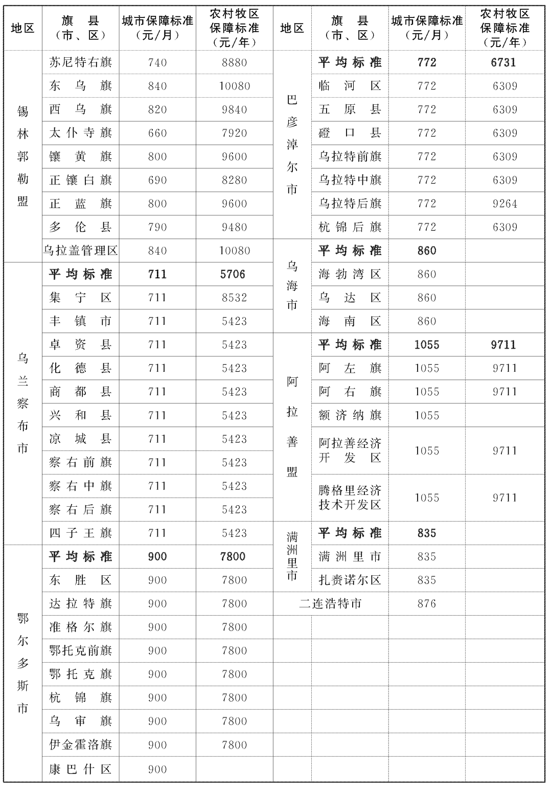 1.内蒙古自治区2022年最低生活保障标准一览表