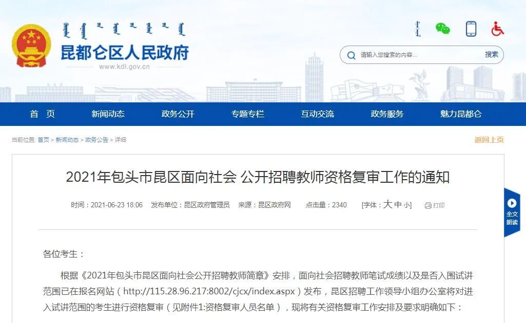 (五)对资格复审后出现名额空缺的岗位,按照各岗位笔试总成绩从高分到低分的顺序依次递补,递补只进行一次(资格复审递补由工作人员电话通知考生,递补名单将在昆区政府信息网-政务公告栏公布,请未进入试讲范围的考生注意查询自己是否进入递补资格复审范围,保持通讯工具畅通,并提前做好相关准备)。