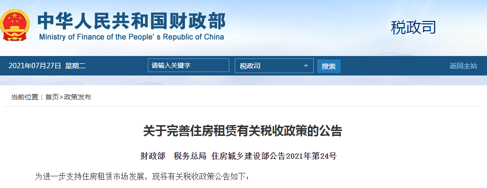 近日,财政部、税务总局和住房城乡建设部联合发布《关于完善住房租赁有关税收政策的公告》,明确进一步支持住房租赁市场发展。