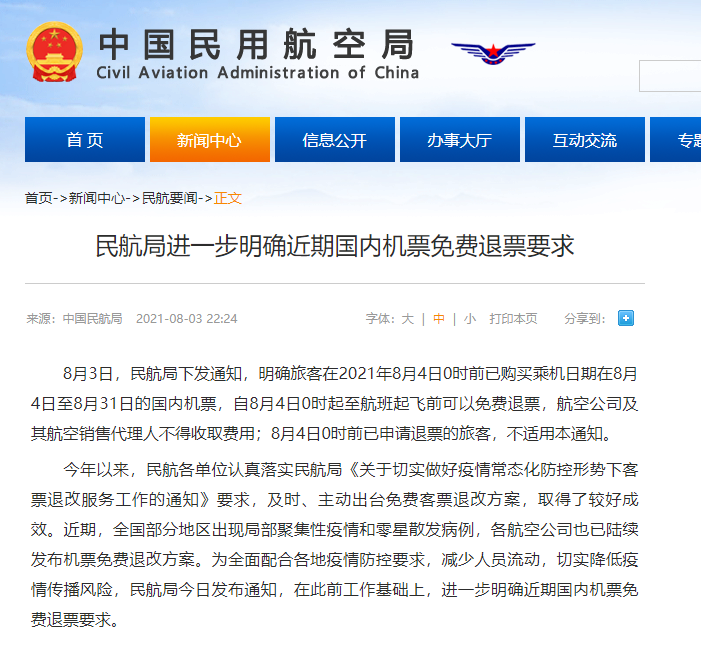 8月3日,民航局下发通知,明确旅客在2021年8月4日0时前已购买乘机日期在8月4日至8月31日的国内机票,自8月4日0时起至航班起飞前可以免费退票,航空公司及其航空销售代理人不得收取费用;8月4日0时前已申请退票的旅客,不适用本通知。