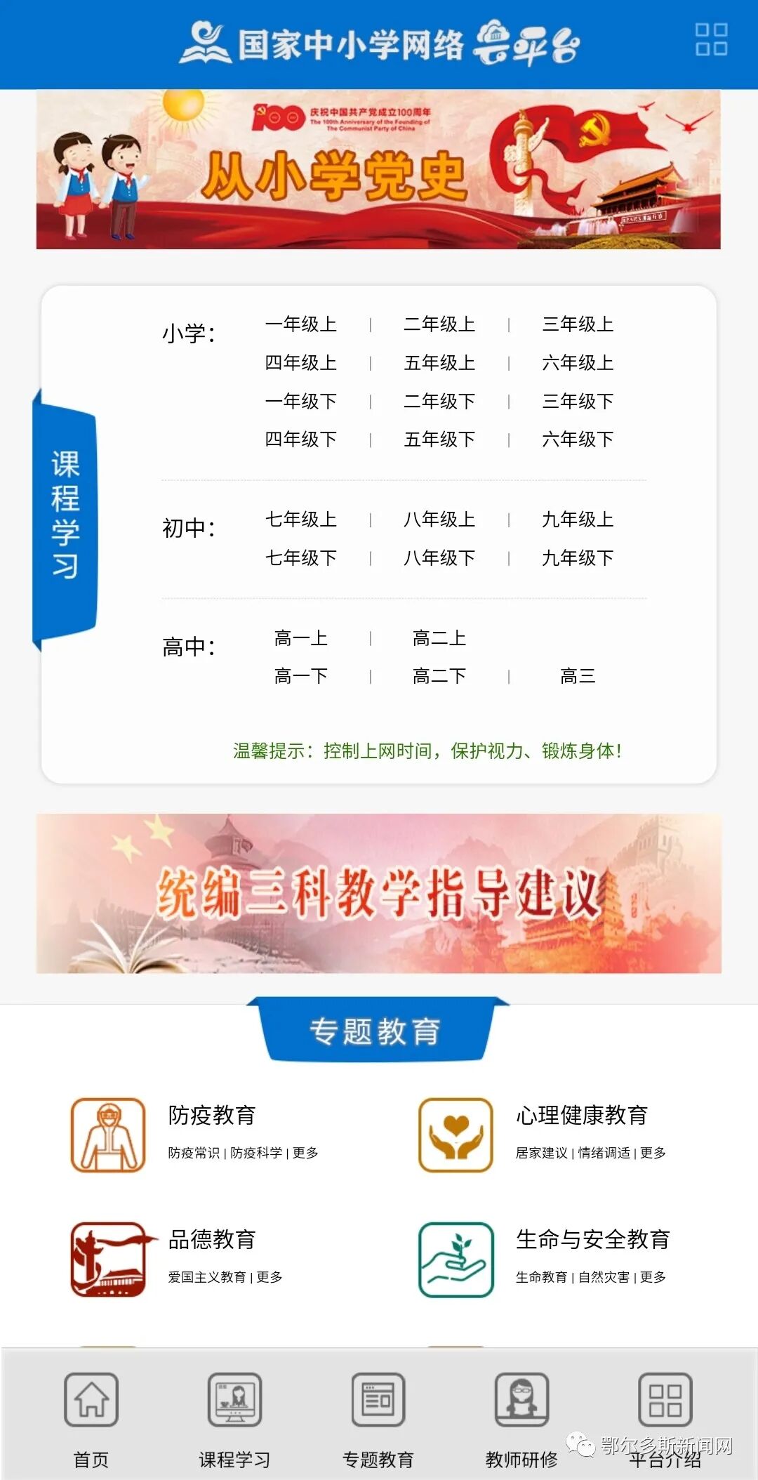 国家中小学网络云平台中小学、初中、高中的所有学科课程免费在线学习,名师讲课。平台上还有许多专题学习内容,如“防疫”主题、心理健康专题教育等。教师也可以在平台上进行研修,其中包括通识研修课程和学科研修课程。