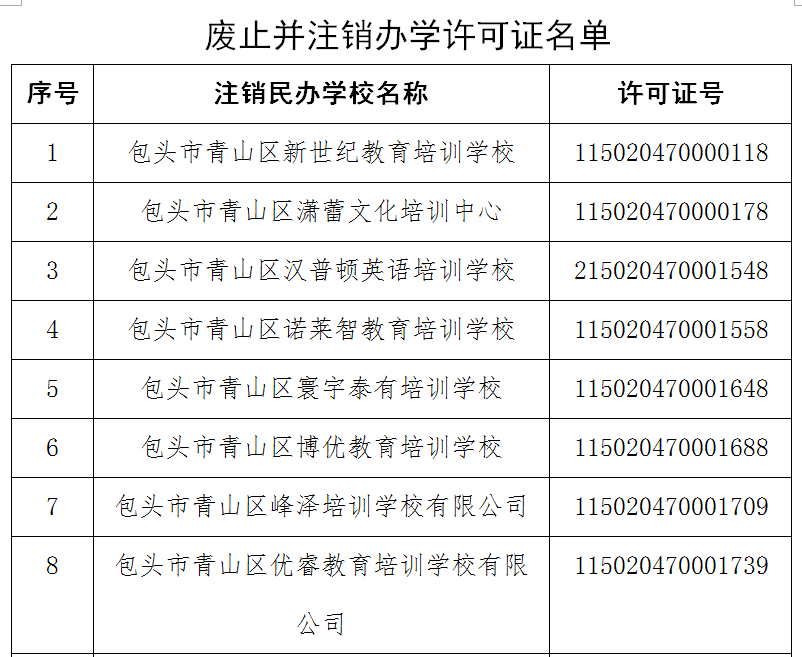 青山区教育局关于废止并注销20所民办学校办学许可证的公告