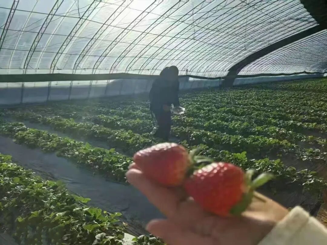 草莓种植户张永军学会在互联网上销售、推荐草莓和草莓采摘:“我家的草莓在美团、高德、百度上都有,正月里,我这一栋一天能出100斤左右,这一正月收入将近两万元。”