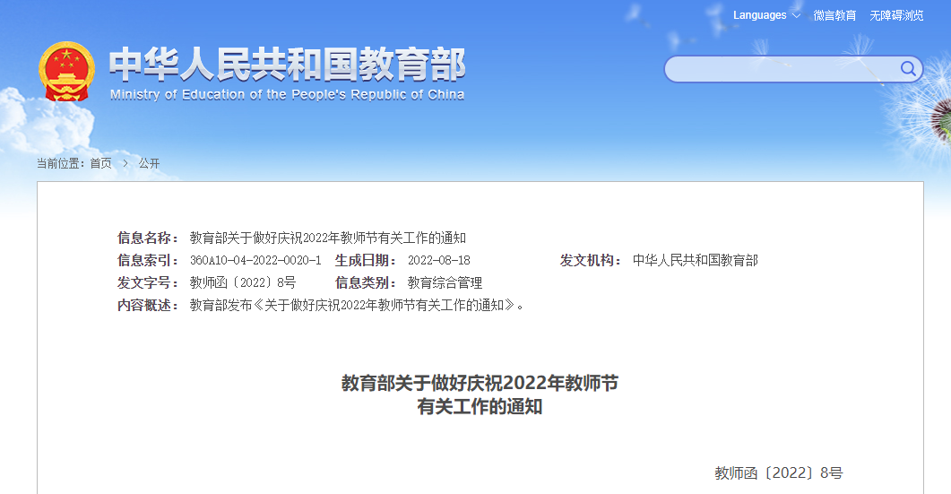 教育部日前发布关于做好庆祝2022年教师节有关工作的通知(以下简称通知)。通知指出,坚持隆重简朴,务实开展活动。各地各校要坚持隆重、简朴、务实的原则,切实避免形式主义、铺张浪费,让广大教师成为教师节的主角,提升教师获得感、荣誉感、幸福感。原文如下