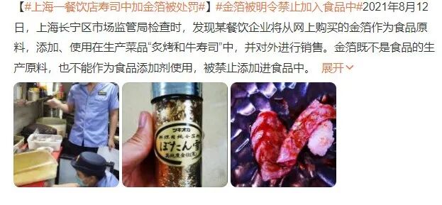 2021 年 8 月,上海一餐饮店就因将金箔作为食品原料,添加、使用在生产菜品“炙烤和牛寿司”中,并对外以每份人民币 48 元进行销售,被上海市场监管局处罚。